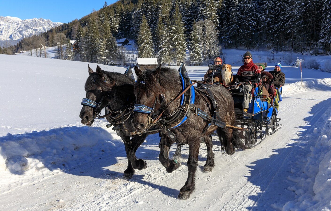 Besonders romantisch ist eine Schlittenfahrt mit dem hauseigenen Pferdegespann. Ob bei strahlendem Sonnenschein, Schneetreiben oder abends bei hellem Mondschein eine Kutschenfahrt ist und bleibt ein unvergessliches Erlebnis.