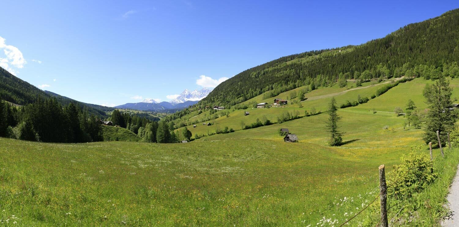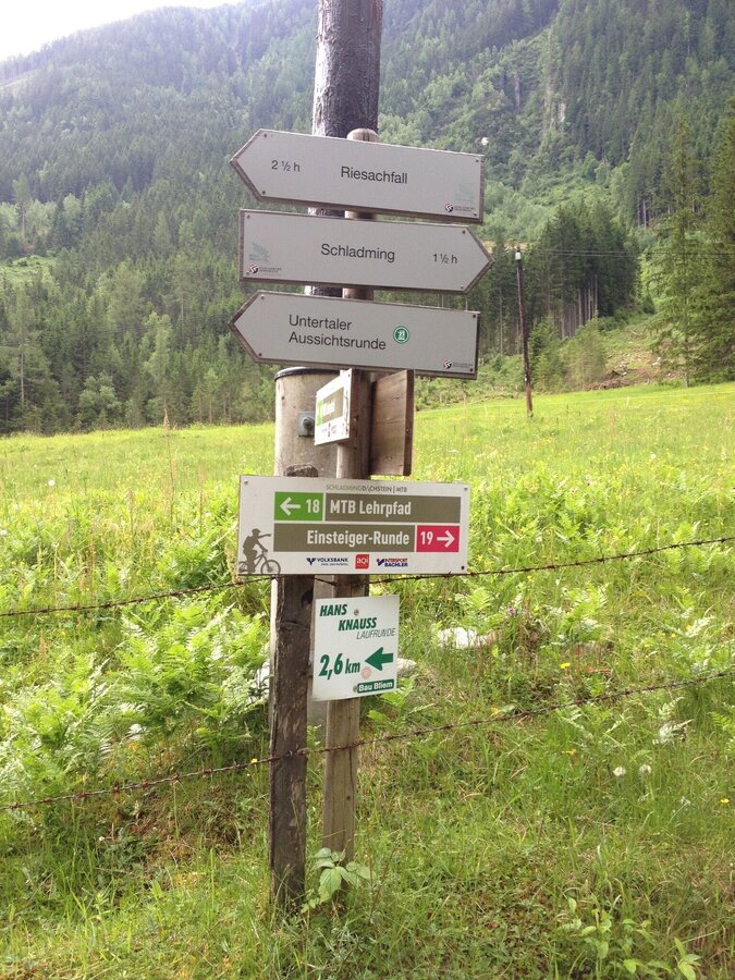 Von hier geht es nun talauswärts. Kurz die Straße entlang und dann rechts hinaus auf den Gföhlweg. Diesen schönen Waldweg läufst du talauswärts oberhalb der Gehöfte am Janerweg vorbei, bis der Wanderweg beim Wieserhof wieder in den Janerweg einmündet. Du folgst dem geschotterten Fahrweg weiter in Richtung Fastenberg. Bei der Forstwegkreuzung beigst du links hinunter in Richtung Untertal und Schladming. Über den Stadlweg erreichst du beim Bauernhof Fenz den Spreizweg. Auf diesem läufst du nun taleinwärts zurück nach Untertal-Dorf.