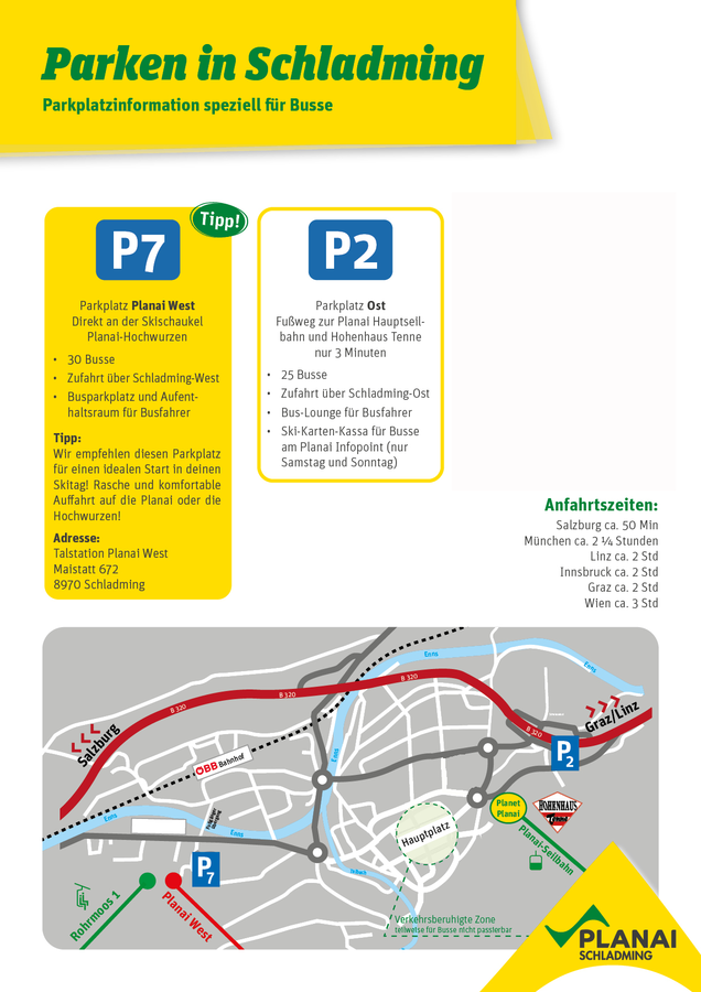 Keine Sorge um den Busparkplatz – wir halten dir den Platz frei! Samstags parkst du direkt am P1 im Planai Stadion oder am P2, nur 3 Gehminuten von der Planai Hauptseilbahn entfernt. Weitere Parkmöglichkeiten findest du beim Wintersportzentrum WEST (Skischaukel Planai-Hochwurzen). Von dort aus bist du blitzschnell auf der Planai oder Hochwurzen unterwegs.