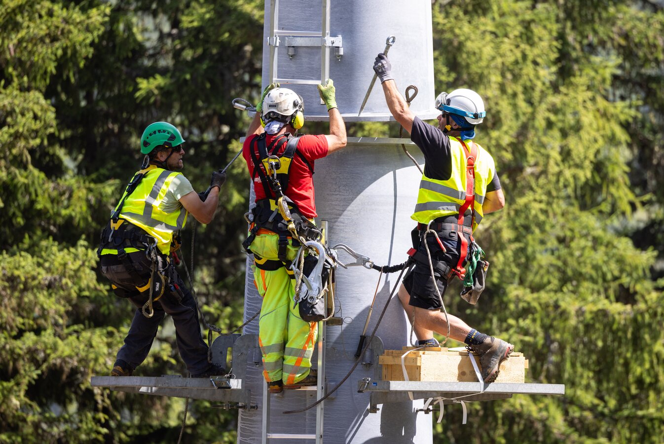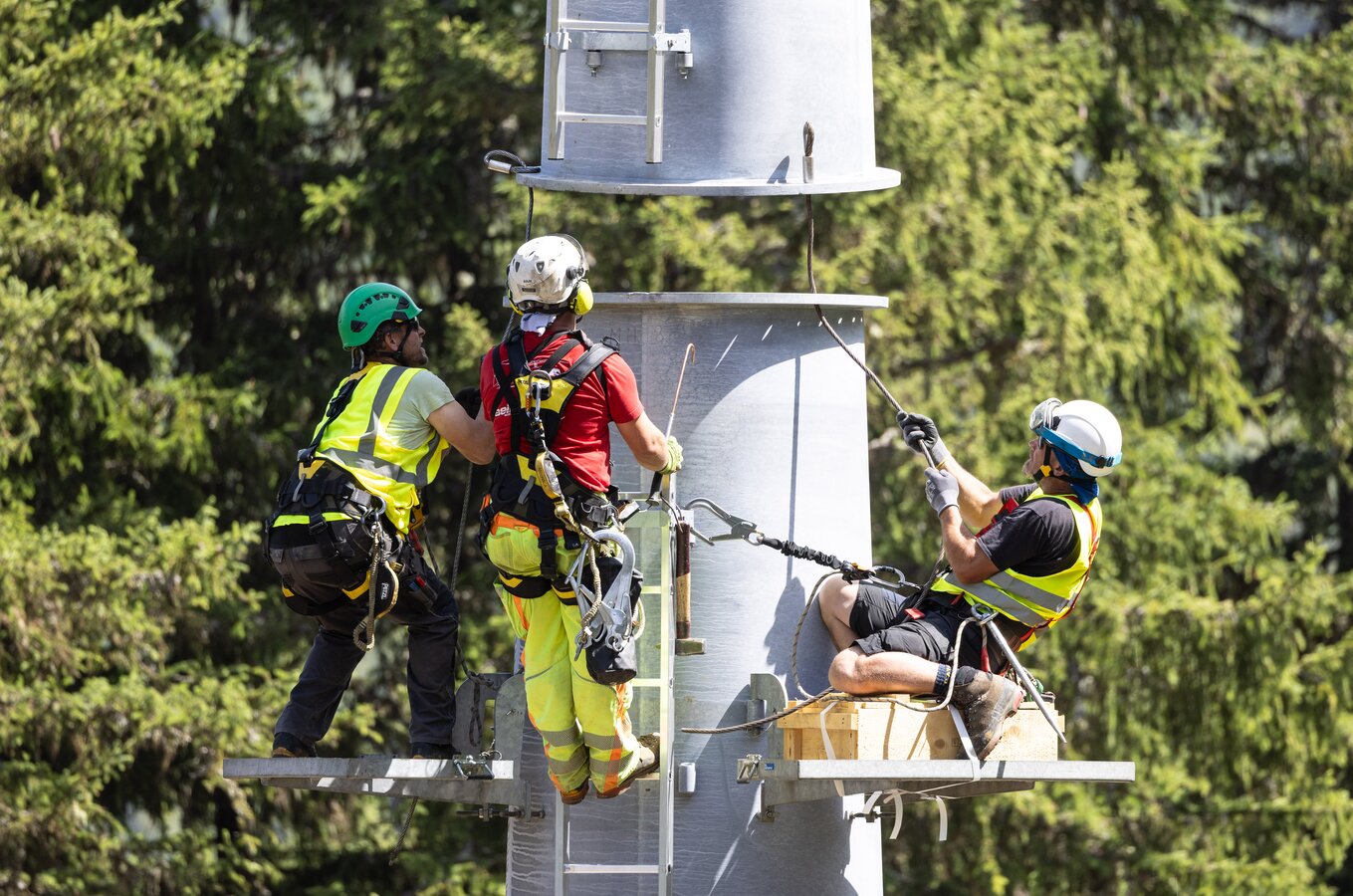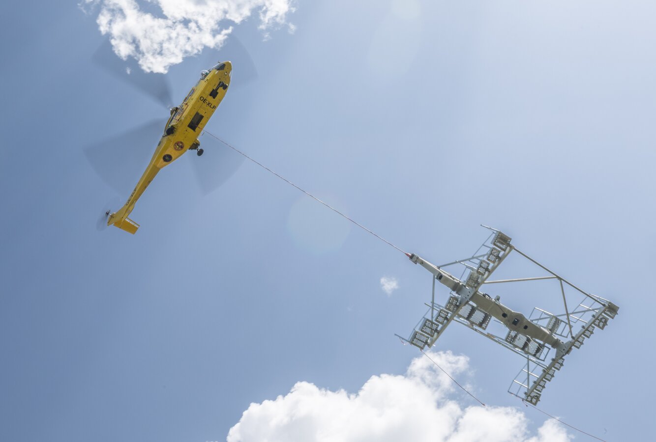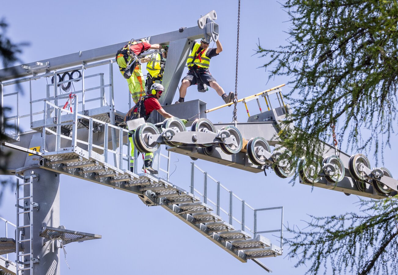 Two powerful helicopters were used for transport: the Super Puma and the P13. Working in precise coordination, they lifted load after load every minute, flew along the future route and placed the support components on the prepared foundations with millimetre precision. At each location, a well-coordinated team of fitters was waiting to immediately align, fix and bolt the components in place.