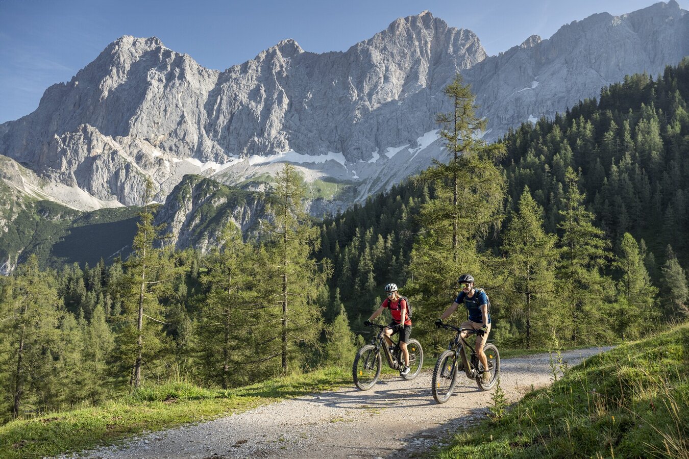 From the Langeggsattel we turn left down to the settlement Neuhaus near Lungötz in the Lammertal. A short distance uphill on a forest path, then we finally reach the Lammertal, where we accompany the river of the same name on asphalted side and main roads. At Niedergschwandt we go up again in direction Zwieselalm. Before the Kleinedtalm, where this time we experience the Dachstein glacier up close from the south side, we turn left up to the Hornspitze, connected by a cable car from Rußbach. The heart of a "Downhiller" will beat faster now, because when we drive down to Rußbach, the narrow gravel road is quite busy at the beginning. We drive to Rußbach partly on meadow paths. From there right on the asphalted, for the time being old road, then junction into the new road up to the pass Gschütt.
