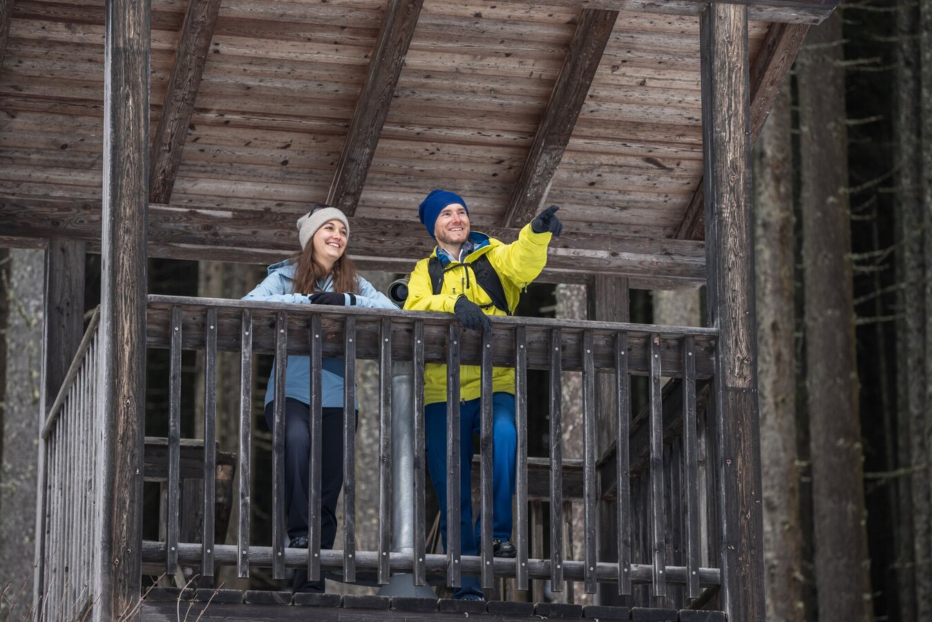 From Gasthof Tetter, follow the signs into the valley along the Wilde Wasser theme trail. The trail accompanying the Untertalstraße road is prepared for pedestrians by the cross-country skiing machine. After just a few metres, you will reach your first highlight - the Aussichtsstadl Tettermoor. Here you can enjoy a marvellous view over the snow-covered moor in winter. Continue into the valley past the lookout tower through the forest to the Waldhäuslalm (TIP: you can enjoy curling here). Directly after the Waldhäuslalm, turn right, cross the bridge over the Untertalbach stream and continue along the cleared forest path to the Sondl-Alm. Along the way you have a wonderful view of the cross-country ski trails, which also lead along the Untertalbach stream to the Sondl-Alm.
